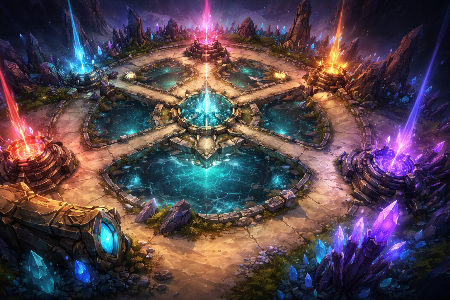 | Map style | Circular, objective centered | Three lane MOBA map |