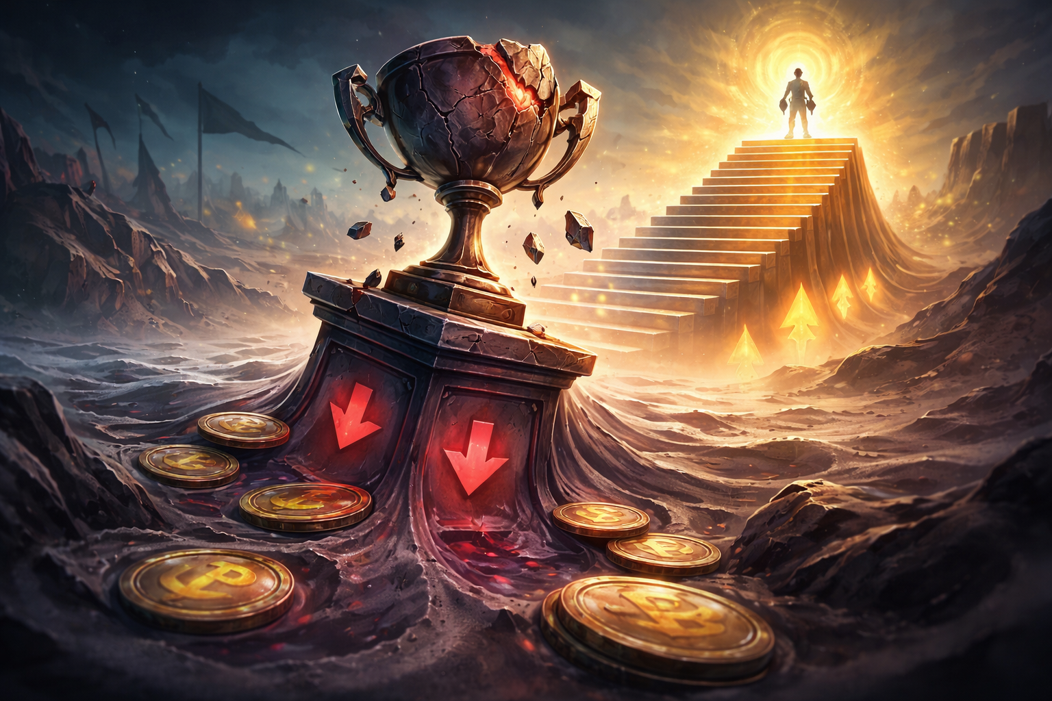 A cracked trophy sinks into a dark barren ground marked with red downward arrows, surrounded by scattered gold coins, while a lone figure stands at the top of a glowing staircase in the distance.