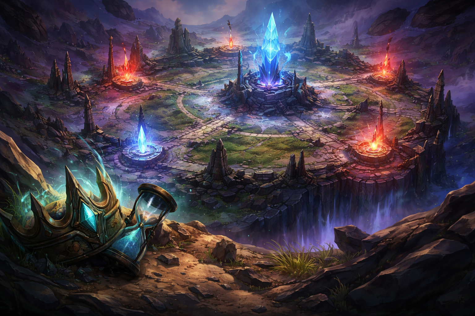 A circular battlefield with a towering blue crystal in the center is surrounded by multiple glowing capture points, while a broken crown and hourglass rest in the foreground overlooking the arena.