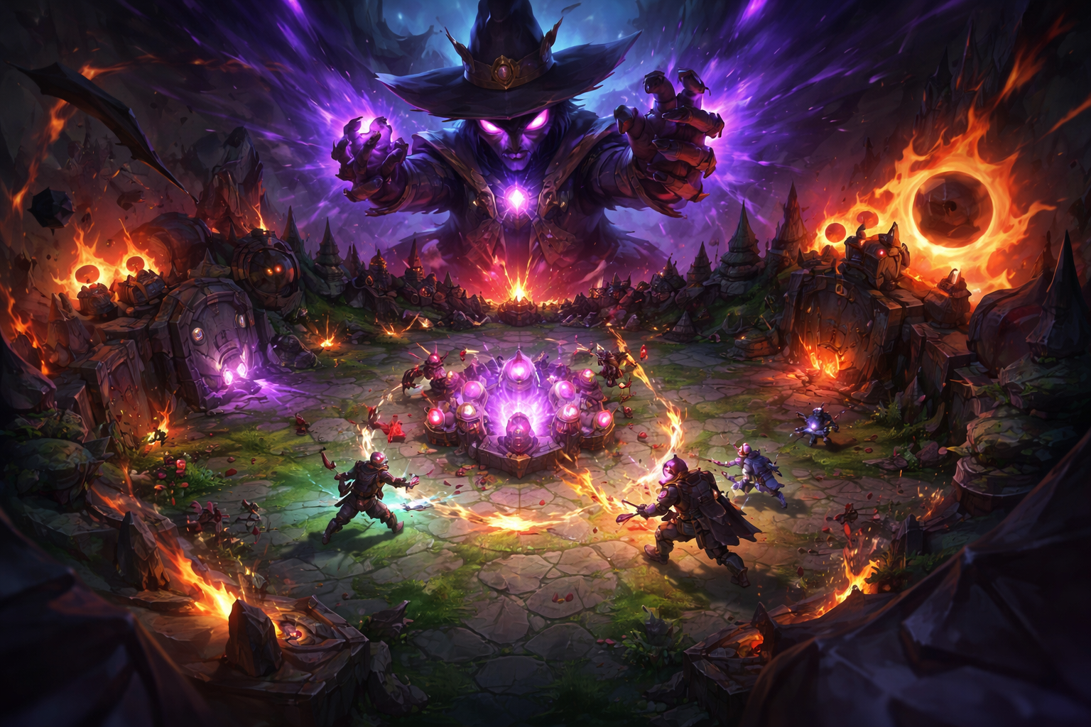 A giant purple shadowy sorcerer with glowing eyes looms over a battlefield, reaching toward a central crystal as small champions fight below amid fire, explosions, and cursed energy.