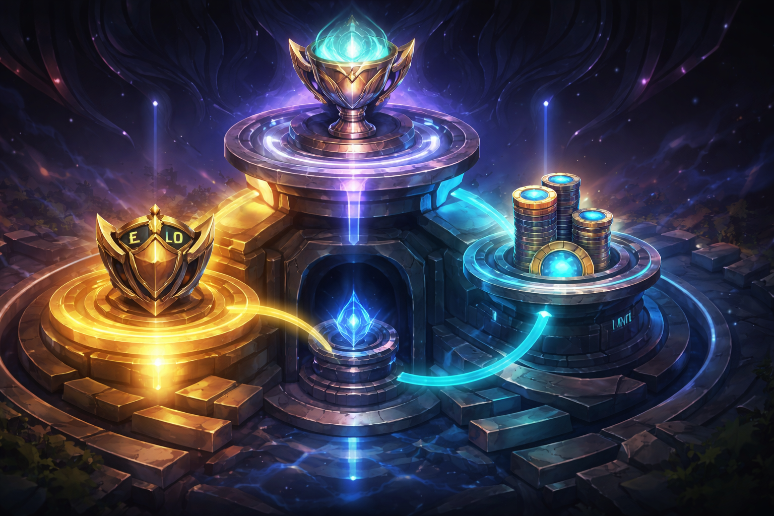 A glowing fantasy structure with three connected platforms shows a trophy at the top, an ELO crest on the left, and stacked blue coins on the right, all linked by bright flowing energy around a central crystal.