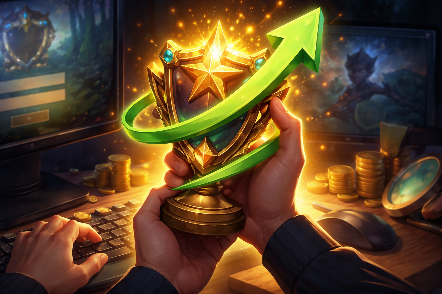 Two hands hold a glowing golden rank trophy while a bright green arrow wraps upward around it, with a gaming desk, keyboard, coins, and two blurred fantasy-style monitors in the background.